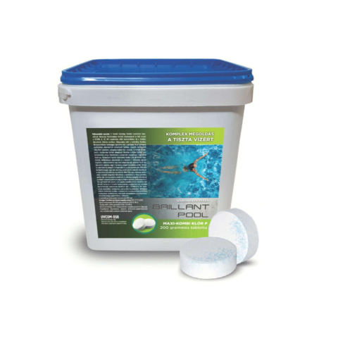 Brillant Pool Maxi-kombi klórtabletta 5 kg Maxi-kombi klórtabletta, 90% klórtartalommal,algaölő és pelyhesítő adalékkal, triklórizocianursav hatóanyaggal, lassan oldódó 200 g-os tabletta. Alkalmazása: A klórszint gyorsan oldódó készítménnyel történő
