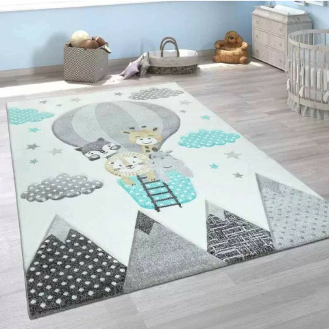 Fehér kék és szürke színű hőlégballonos gyerekszőnyeg. Vidám, játékos hangulatú szőnyeg. Visszafogott színvilága hozzájárul a gyerekszoba harmonikus megjelenéséhez. A vidám állatkák látványa a gyermekeket játékra ösztönzik. 160x230 cm Szálösszetétel:...
