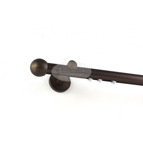 A gömb végzárós bronz színű 1 rudas, belső sínes 25 mm átmérőjű fém karnis szett tartalma: 1 db bronz színű belső sínes fém karnisrúd a kiválasztott hosszúságban 2 db gömb formájú, bronz színű fém karnis végzáró (átmérője kb. 4 cm) bronz színű modern fém