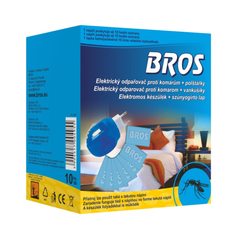 Bros elektromos szúnyogriasztó készülék + 10 szúnyogirtó lapka Termékleírás: Az elektromos csatlakozóba dugható párologtató, a hatóanyag-párnával védelmet biztosít a fény által vonzott rovarok ellen. Az eszköz csatlakoztatása nyomán megindul a hatóanyag