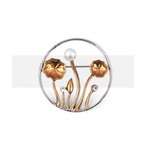 ,Gö,mbö,lyű bross gyö,ngyö,kkel é,s csiszolt kö,vekkel. A belső minta virá,gra emlé,keztet. Jó,l mutat tá,ská,n, kalapokon. Lakodalmakra alkalmas.A há,tsó, oldalá,n kapocs tű talá,lható,. , ,ö,sszeté,telé,kszer fé,m galvanizá,lá,salü,veg