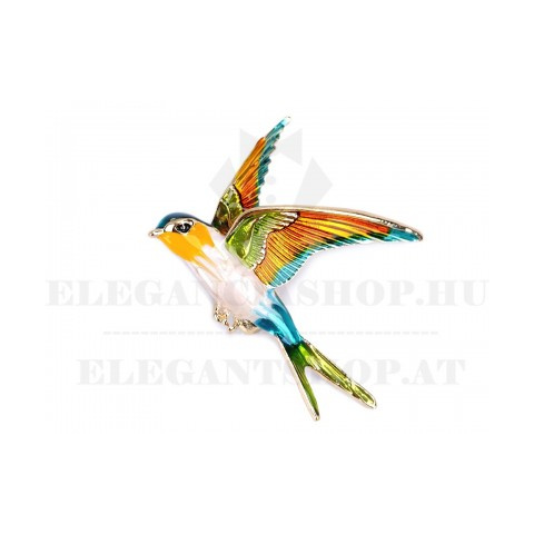 A bross madá,r szí,nes zomá,nccal eredeti divaté,kszer, mely mindennapi é,s alkalmi viseletnek is alkalmas. A há,tuljá,n biztosí,tó,tű van. Viselhető ruhá,n, kalapon, tá,ská,n, kendőn. Mé,retek: 5,2 x 5,5 cm A gombostű hossza: 1,5 cmö,sszeté,telé,kszer fé,m galvanizá,lá,sal
