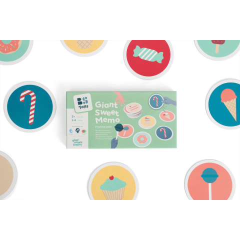 A BS Toys Óriás memóriajáték, édességek egy színes és vidám készségfejlesztő társasjáték, amely már 3 éves kortól garantál szórakozást az egész családnak. A játék lényege, hogy a gyerekek megkeressék és párosítsák az azonos édességeket ábrázoló kártyákat