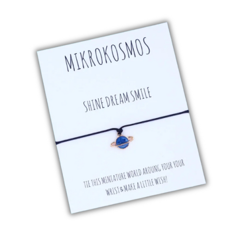 Stílusos BTS Mikrokosmos karkötő fekete bőrszállal és kék bolygó medállal, egyedi ajándékkártyán. Tökéletes K-pop rajongók számára