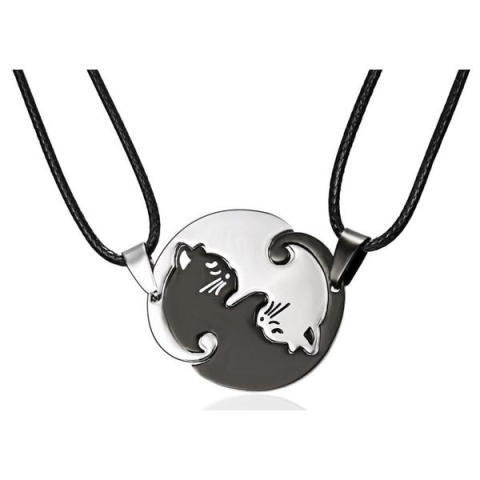 Egyedi páros nyaklánc cicás motívummal, rozsdamentes acélból. Tökéletes romantikus ajándék pároknak vagy macskabarátoknak, tartós és stílusos