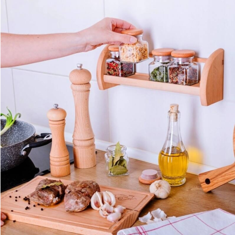 A polc bükkfából készült. A 120 ml-es fűszertároló edények kiváló minőségű üvegből, a dugók bükkfából készültek.
