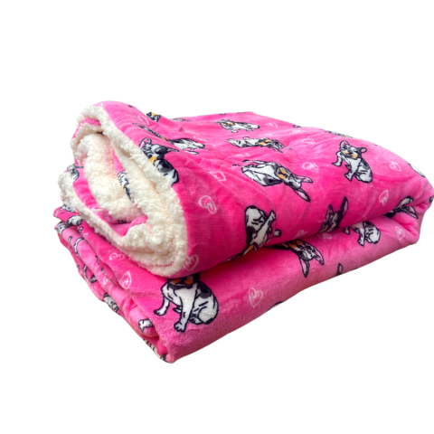 A pléd egyik oldala mikroplüss anyagból (pink francia bulldog mintás), másik oldala fehér bárány bunda utánzatból készült.