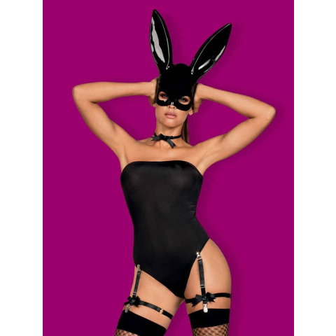 Csodálatos nyuszilány jelmez, melynek tartalma egy rugalmas, szaténos anyagból készült pánt nélküli body, két harisnyatartós, méretre állítható combpánt, egy rugalmas pánttal ellátott nyuszifül, egy nyakpánt és egy pár necc combfix. Csodálatos nyuszi
