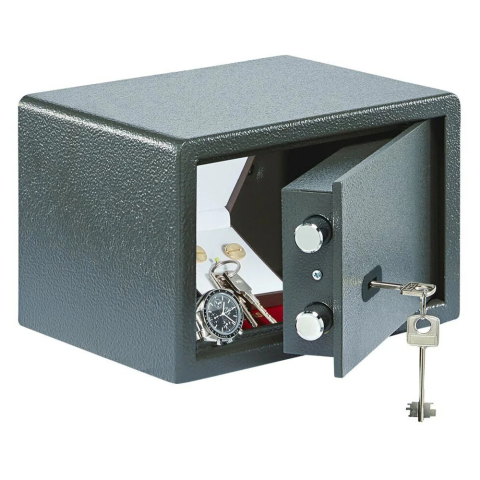 Burg Wachter-PS 110 K széf kulcsos zárral •megbízható bútorszéf kulcsos zárral•2 mm-es egyfalú acél test•48 mm vastag ajtó, 6 mm-es acél borítással•90 fokos ajtónyitás jobboldali zsanérokkal•egyirányú zárás 22 mm-es acél hevederekkel•Secu 6 lamellás du