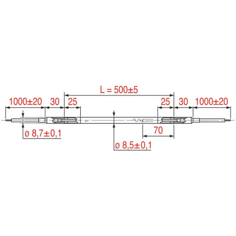 1,6 W/cm² | teljes hossz 538 mm | forró rész hossza 442 mm | kábelek hossza 1000 mm | izzítás 1100°C