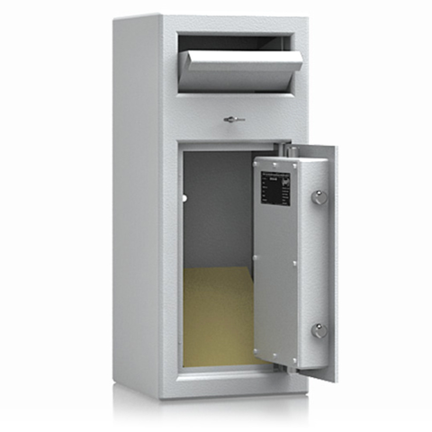 bútorszéf bedobó szerkezettel •lefelé nyíló csúszdás bedobó szerkezet•bedobó nyílás külön zárható (2 db kulccsal)•maximális kihalászás elleni védelem•3 mm vastag egyfalú acél test•52 mm vastag duplafalú ajtó, 6 mm-es acél borítással•90 fokban jobbra ny