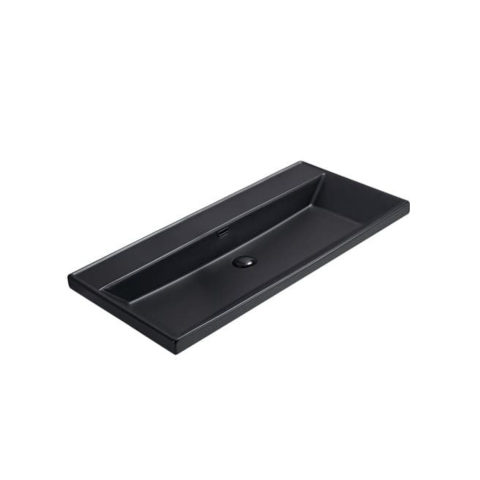Nábytkové umyvadlo v černé matné barvě s otvorem pro baterii uprostřed o šířce 101 cm a hloubce 46,5 cm. Balení bez sifonu a baterie.