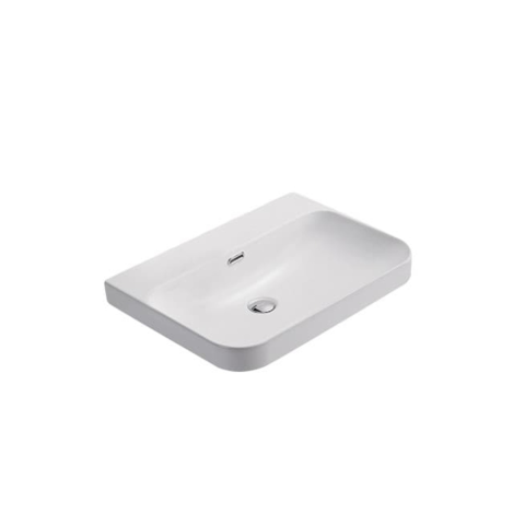Nábytkové umyvadlo v matné bílé barvě s otvorem pro baterii uprostřed o šířce 60,5 cm a hloubce 46,3 cm. Balení bez sifonu a baterie.