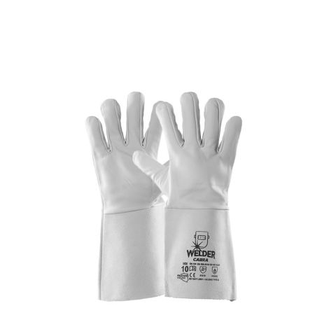 Kecskebőr 35 cm hosszú kesztyű. Hasított bőr mandzsetta, artéria, köröm és ökölcsontvédő. Merev mandzsettával. Minősítés: EN388.