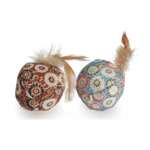 Macskajáték, gömb alakú, virágmintával és tollal.