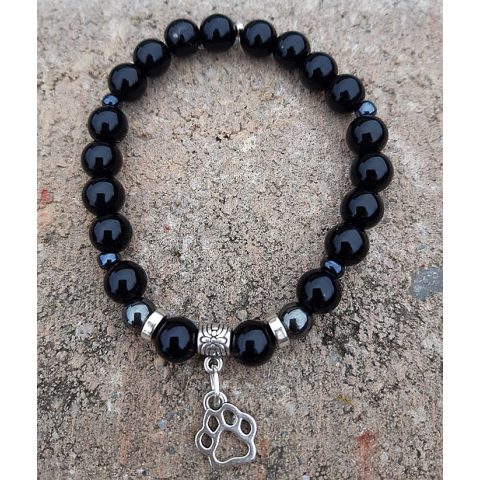 Divatos onyx és hematit kövek kombinációja fém kuya tappancs díszítő elemmel. A gyöngyöket összetartó gumidamil erős és rugalmas. A gyöngyök átmérője körülbelül 8 mm.Féldrágakövek gyönyörű kombinációjaEllenállóKönnyű és