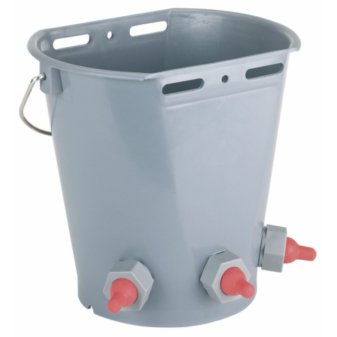3 cuckival bárányitató vödör 3 cumival - műanyag - 1-6 bárány itatásához - tartólemezzel, cumikkal és szelepekkel együtt - élelmiszeripari felhasználásra ajánlott - mindkét oldala lapított - megerősített kivitel - szállítás fedél nélkül 3 cuckiv