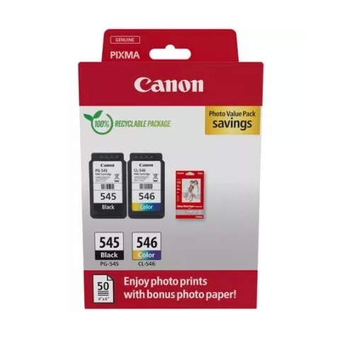 Takarékos csomag eredeti CANON tintapatronokkal mindennapi nyomtatáshoz és fotókhoz. Tartalmaz egy fekete PG-545 és egy színes CL-546 patront (mindkettő 8 ml) akár 180 fekete oldalhoz és 180 színes oldalhoz, továbbá 50 lap fényes fotópapírt 10 × 15 cm méretben. Az eredeti Canon tinták állandó minőséget, megbízhatóságot és élénk színeket biztosítanak kedvező áron.Válassza a CANON eredeti megoldását, és élvezze a gondtalan dokumentum- és fotónyomtatást. Ez a