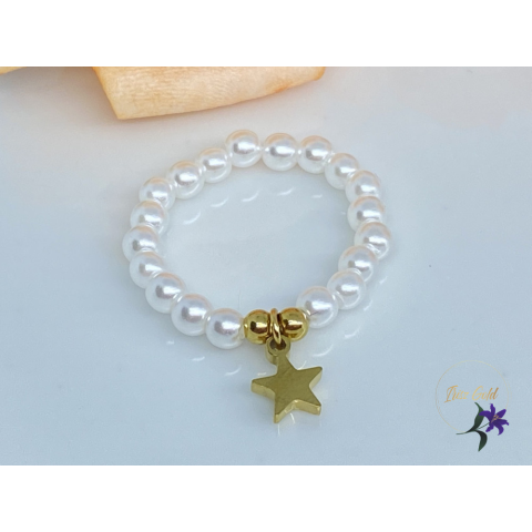 Gyönyörű hófehér gyöngyökből álló gyűrű csillag köztesselSzin: fehér: Gyöngy :3mm Méretnélküli :56-60 -as méretnek ajáljuk