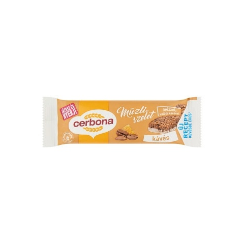 Cerbona Kávés müzliszelet fehér bevonó talppal 20 x 20 g / 20 db Új recept Kevésbé édes* A Cerbona Kávés müzliszelet megújult receptúrájának köszönhetően értékesebb tápanyag összetételű termék, élelmi rostban gazdag, ezáltal még jobban beilleszthető az eg