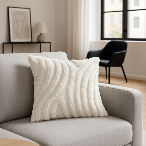 Ez a díszpárnahuzat modern és elegáns megjelenést kölcsönöz bármely nappalinak. A huzat puha, fehér textilből készült, amelyet enyhén bolyhos, hullámszerű mintázat díszít – ez nemcsak látványra, de tapintásra is különleges élmé