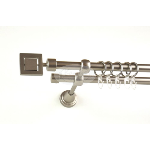 A CHICAGO 240 cm-es nikkel-matt színű 2 rudas fém karnis szett tartalma: 2 db 240 cm-es nikkel-matt színű 16 mm átmérőjű fém karnisrúd 2 db Chicago típusú nikkel-matt színű fém karnis végzáró 2 db Kansas típusú, kupak formájú fém karnis végzáró 3 db falr