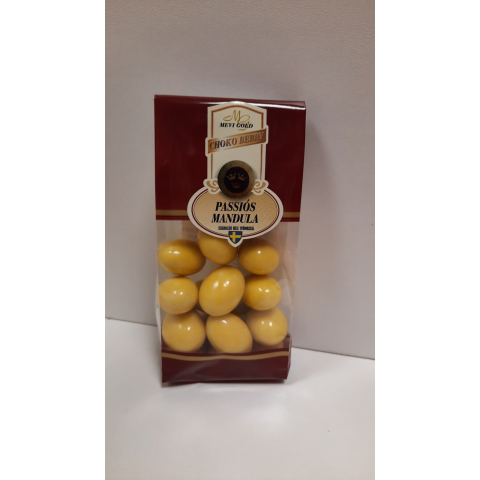 Fehércsokoládés (77%) mandula (20%), passió gyümölcs ízesítéssel Passiós mandula-Összetevök:cukor,MANDULA(20%), kakaóvaj,TELJES TEJPOR,SAVÓPOR,LAKTÓZ,koncentrált passió gyömölcslé,savanyúságot szabályzó(almasav,nátrium malát), emulgeáló szer (SZÓJALEC