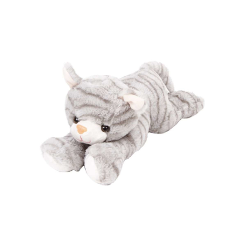 Fekete gombszemű cica plüssfigura, csíkos szőrrel! A szürke Cica plüssfigura egy vidám, nagyon kedves macska, fekvő plüssfigura kivitelben. A cica rövid, selymesen puha szőrrel készült, az orra rózsaszín, fekete gombszemeivel mindig figyelemmel fog kí