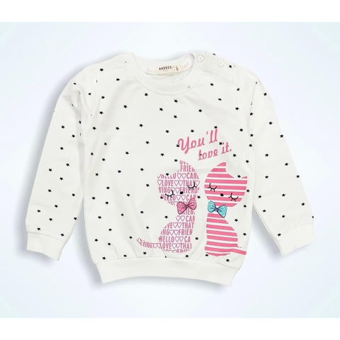 Nyomott mintás, kényelmes, hosszú ujjú lány pulóver, a 92-98 méret bal vállán gombokkal. Teljes hossz: 44 cm Ujjhossz (nyaktól): 45 cm Ujjhossz (varrástól): 38 cm Szélesség: 33 cm Márka: Breeze Származási ország: Törökország Anyag összetétel: 90 % pamu