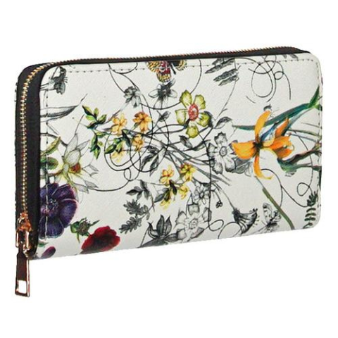 3 oldalán cipzáros fehér alapon mezei virágmintás műbőr pénztárca fekete cipzárral