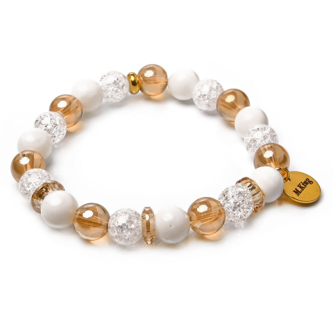 RUGALMAS KARKÖTŐ, a mérete választható.Az ékszer ásványai és tartozékai:– 8 mm-es arany angyal aura gyöngyök– 8 mm-es roppantott fehér hegyikristály gyöngyök– 8 mm-es valódi kagyló gyöngyök– Arany színű üvegdíszek– M.King
