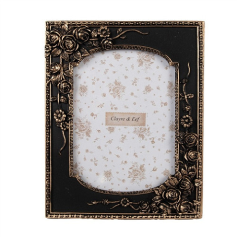A(z) Fekete képkeret rózsás, arany antikolással, 18x23/13x18cm, műanyag egy stílusos és igényes darab műanyag anyagból készült , mérete: Képkeret: 18x23cm . A termék a(z) Clayre & Eef márka kínálatából származik , eredeti származási helye: Hollandia.
