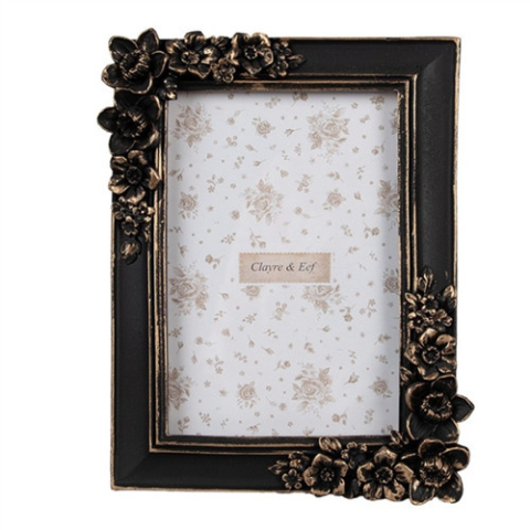 A(z) Fekete képkeret virágos, arany antikolással, 15x20/10x15cm, műanyag egy stílusos és igényes darab műanyag anyagból készült , mérete: Képkeret: 15x22cm . A termék a(z) Clayre & Eef márka kínálatából származik , eredeti származási helye: Hollandia.