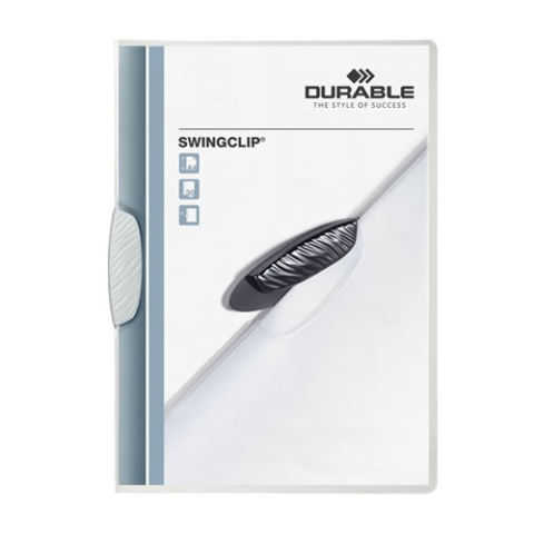 Clip-mappa Durable Swingclip A/4 30 lapig fehér Méret: A/4 Lapkapacitás: 30 lap Szín: fehér strapabíró PP anyagból készült klipes gyorsfűző áttetsző előlap, szürke hátlap, színes klip 30 lap lyukasztás néküli lefűzésére alkalmas