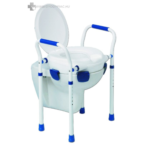 Állítható magasságú lábakkal felszerelt, melyek tökéletes stabilitást biztosítanak. Kartámaszok segítenek a leülésben és a felállásban. A képen látható tartály illusztráció, bemutatja, hogy a wc magasító milyen módon lleszkedik a WC csészére, a wc csész