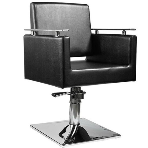 Elegáns exklusív fodrász hajvágószék, stabil kocka talppal, hidraulikus pumpával, króm karfával fekete színben
