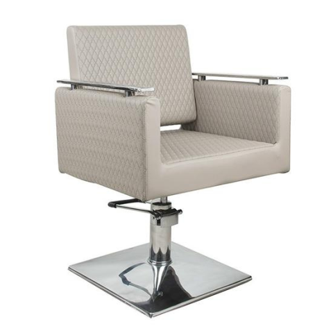 Elegáns exklusív fodrász hajvágószék, stabil kocka talppal, hidraulikus pumpával, króm karfával matt bézs-szürke színben