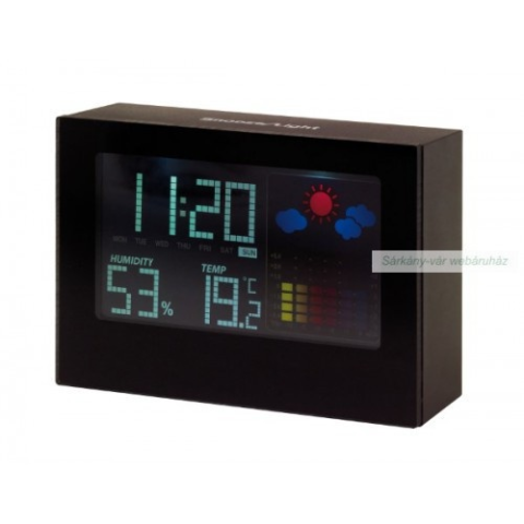 COLOUR ébresztőóra időjárás előrejelzéssel, ébresztő funkcióval, dátum és óra kijelzéssel, hő- és páratartalom mérővel (°C és °F), érintésre kivilágosodó színes LCD kijelzővel, fekete háttérrel, adapterről is működtethető, ami nem tartozék Mérete: 8.5 x