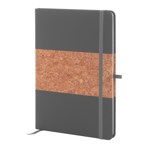 Természetes parafa és újrahasznosított PU bőr borítású jegyzetfüzet hozzáillő színű könyvjelzővel, gumiszalaggal és tolltartóval. 80 vonalas lappal, újrahasznosított papírból. A5 méretű.