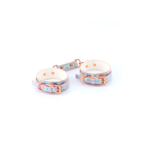 COSMO holografikus csukló bilincs.Rose Gold nikkelmentes fémből díszített és teljesen állítható az univerzális illeszkedés érdekében. Könnyen tisztítható vinylből készült.Szélessége:3,3cm.