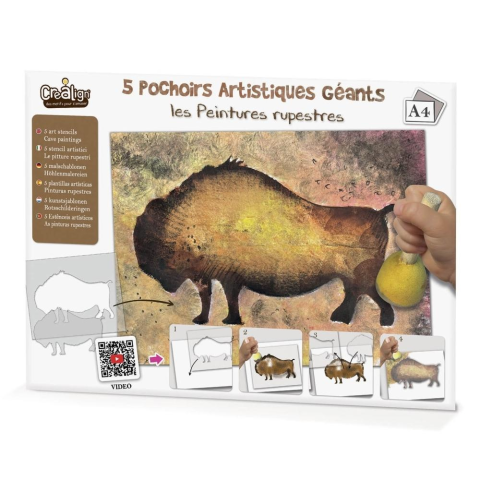 5 db nagyméretű stencil sablon különlegesen szép barlangi képek készítéséhez. A sablonok segítségével a gyerekek művészi képeket hozhatnak létre több fázison keresztül. A készlet tartalma 5 db stencil és 5 db ellenforma.
