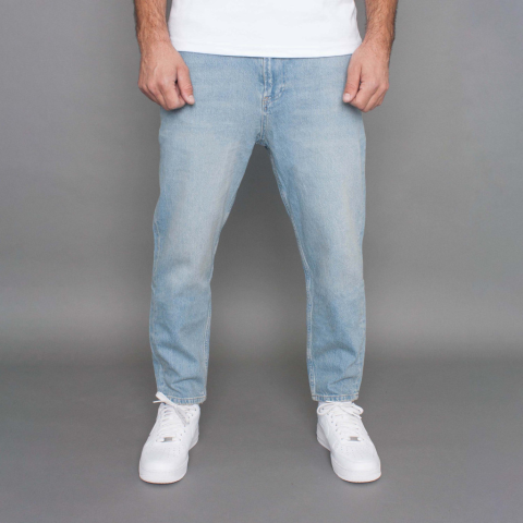 Carrot Fit, laza szabású koptatott világoskék farmer, lefelé szűkülő bokáig érő fazon, zsebekkel és gombos sliccel Modell: 185 cm/ 85 kg/ 32-es méret