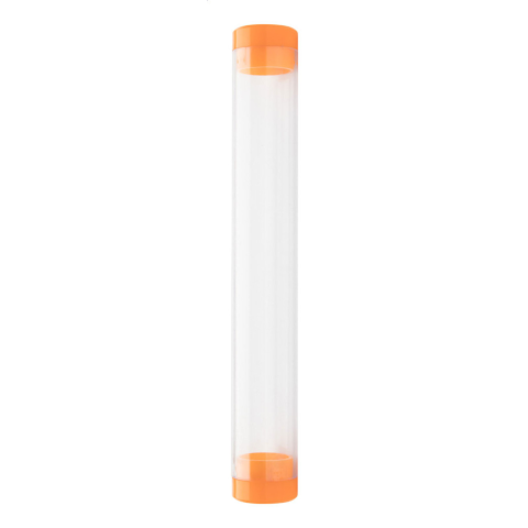 Átlátszó műanyag, henger alakú tolltartó, színes zárókupakokkal.