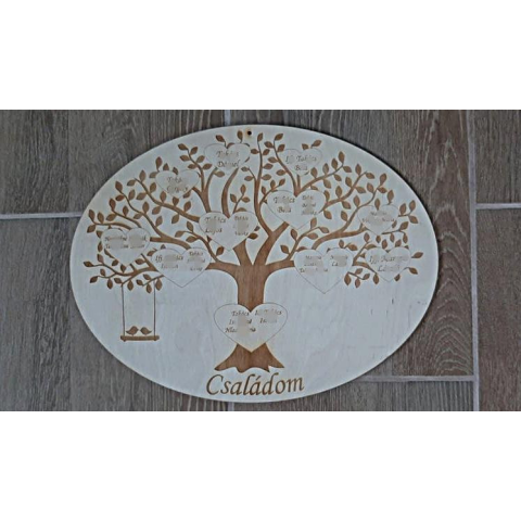 Egyedi méretű gravírozott fa tábla.Mérete függ a gravírozni kívánt nevek számától, a betűk méretétől ( nevek hossza miatt változó). A képen látható tábla kb. 40x30 cm-es ovális 3 mm vastag rétegelt lemezből készült. Gravírozott Családfa Fa Tábla - Eg