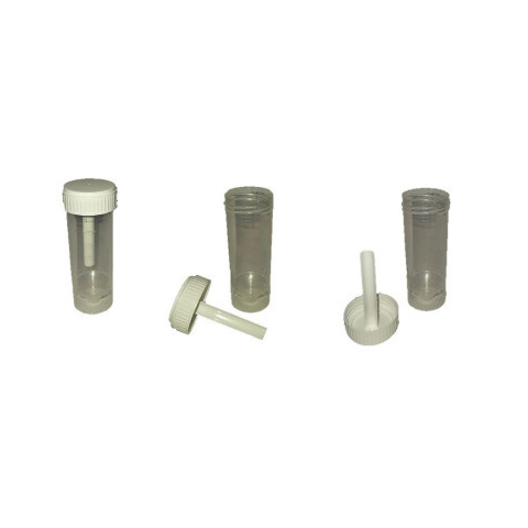 Anyag: polipropilén, tető:polietilén. Jellemzők: két részes, integrált kanalas, csavaros fehér tetővel, nem steril, mattított feliratozási felülettel, skálával. Méret: 30 ml, felső átmérő 29,1 mm. Magasság tető nélkül: 81 mm, tetővel 82mm.