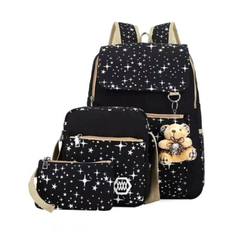 Csillagos iskolatáska szett – 3 részes, Fekete KBL-1143-01-FEz a vidám és praktikus iskolatáska szett kiváló választás iskolakezdéshez, utazáshoz vagy hétköznapi használatra. A szett három különböző méretű és funkciójú táskából áll, amelyek azonos színűek és csillagmintás díszítéssel vannak ellátva – így nemcsak hasznosak, hanem stílusosan is összeillenek.A szett tartalma:1 db hátizsák – nagy főrekesszel, elülső cipzáras zsebbel, párnázott vá