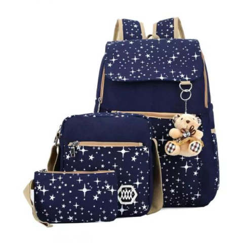 Csillagos iskolatáska szett – 3 részes, Kék KBL-1143-01-KEz a vidám és praktikus iskolatáska szett kiváló választás iskolakezdéshez, utazáshoz vagy hétköznapi használatra. A szett három különböző méretű és funkciójú táskából áll, amelyek azonos színűek és csillagmintás díszítéssel vannak ellátva – így nemcsak hasznosak, hanem stílusosan is összeillenek.A szett tartalma:1 db hátizsák – nagy főrekesszel, elülső cipzáras zsebbel, párnázott váll