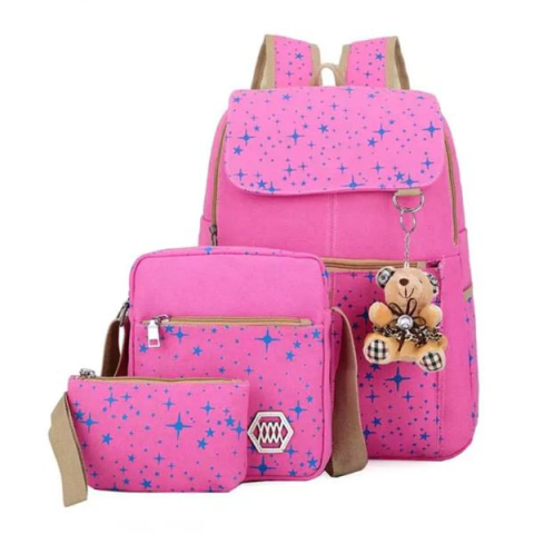 Csillagos iskolatáska szett – 3 részes, rózsaszín KBL-1143-01-REz a vidám és praktikus iskolatáska szett kiváló választás iskolakezdéshez, utazáshoz vagy hétköznapi használatra. A szett három különböző méretű és funkciójú táskából áll, amelyek azonos színűek és csillagmintás díszítéssel vannak ellátva – így nemcsak hasznosak, hanem stílusosan is összeillenek.A szett tartalma:1 db hátizsák – nagy főrekesszel, elülső cipzáras zsebbel, párnázot