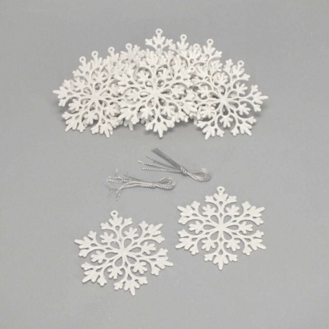 Csillámos felakasztható hópehely díszek, ezüst színű akasztóval.Méret: 9,5cm, 12db/csomag