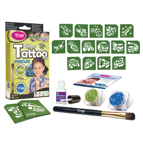 Csillámtetoválás szett, Járművek, 15 sablonnal és 2 csillámporral